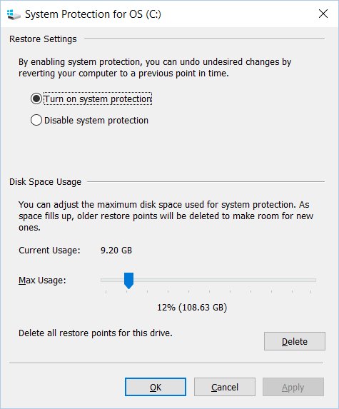 After turning the system protection on set the Max Usage, I set mine to about 10% give or take. Click apply then ok.